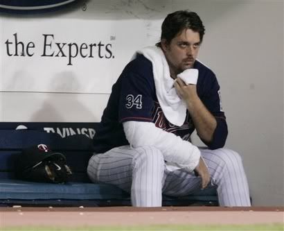 The Royals tying the game at this point was not Twins' main concern. On an Emil Brown single to second, Castillo fielded the ball and from the looks of it, rolled his ankle. He exited the game and was replaced by Luis Rodriguez playing third, moving Punto to second. No word on Castillo's status, but hopefully he'll be able to shake it off by the New York series.This was a little too much for Boof apparently, because he was replaced by Jesse Crain (4.10 ERA) mid-inning. On Crain's very first pitch, Ryan Shealy singled to bring home Sweeney, with the run credited to Boof. Crain got out of the inning and Dennys Reyes (0.89 ERA) pitched a no-hit scoreless seventh, then one batter into the eighth. Juan Rincon (2.61 ERA) came in to retire the last two batters in the inning.